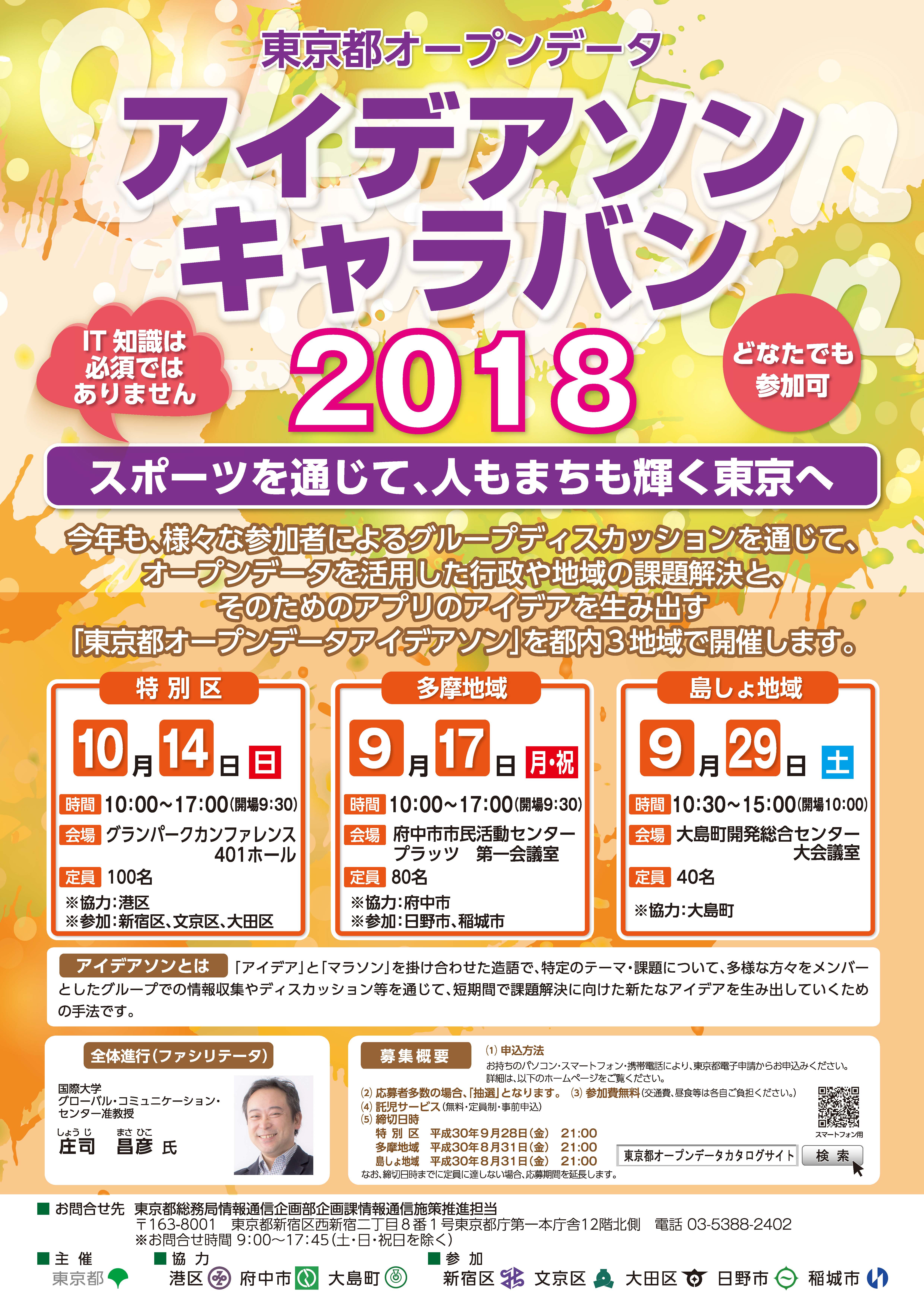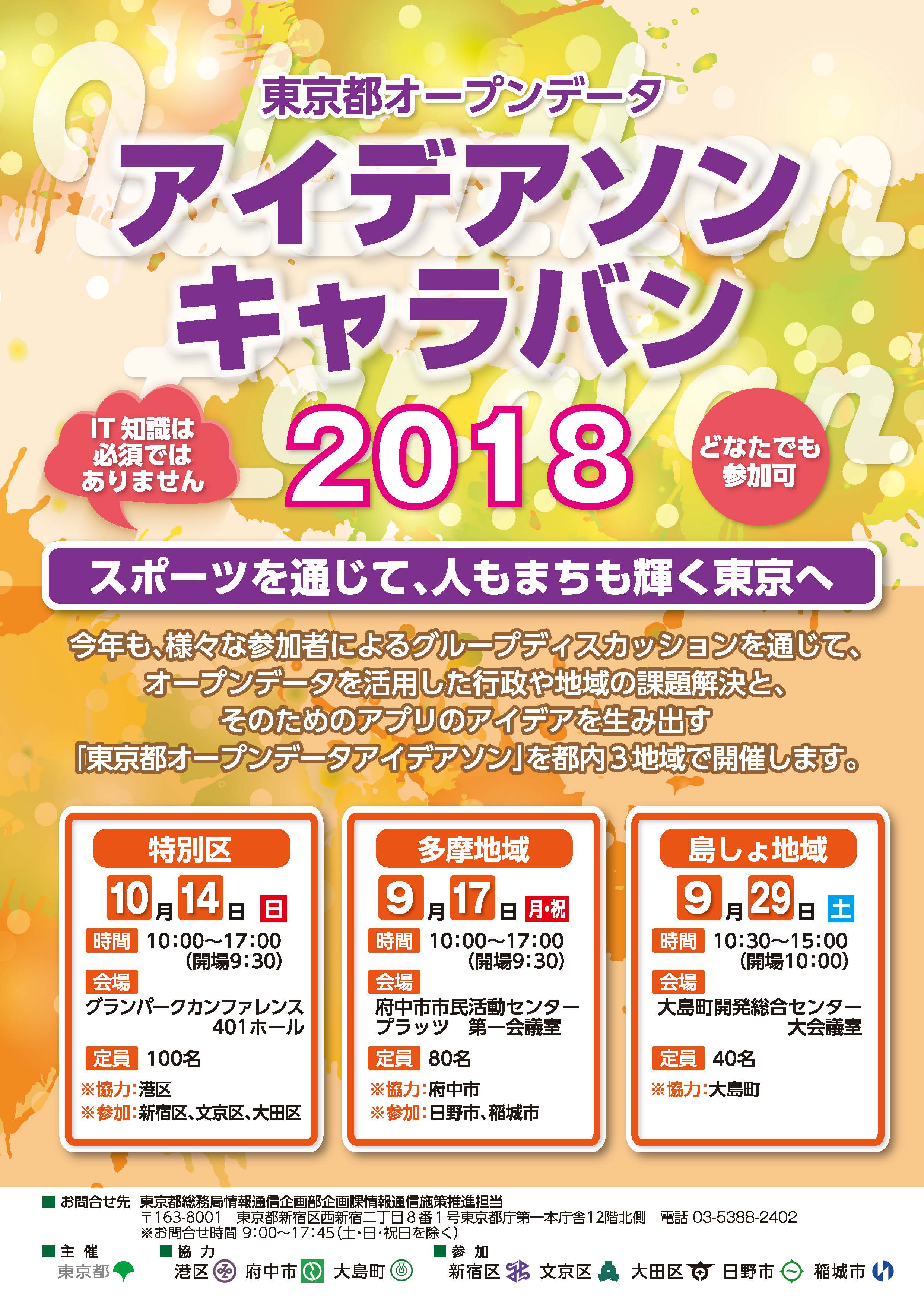 ◆アイデアソンキャラバン全日程終了今年度の東京都オープンデータアイデアソンキャラバン2018は、全日程終了しました。多くの方々にご応募、ご参加いただきまして、誠にありがとうございました。 (H30.10.15 10:30更新) |