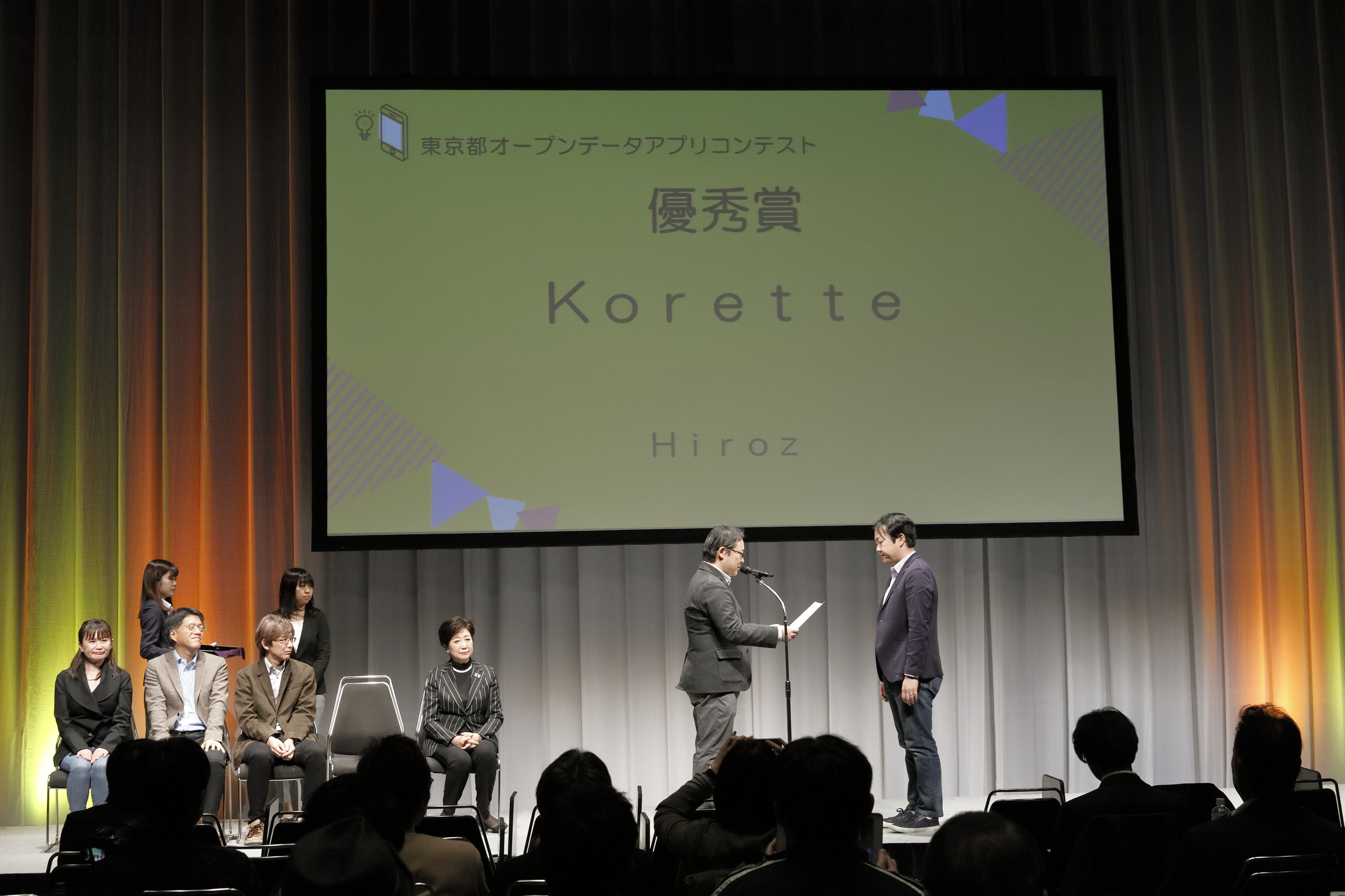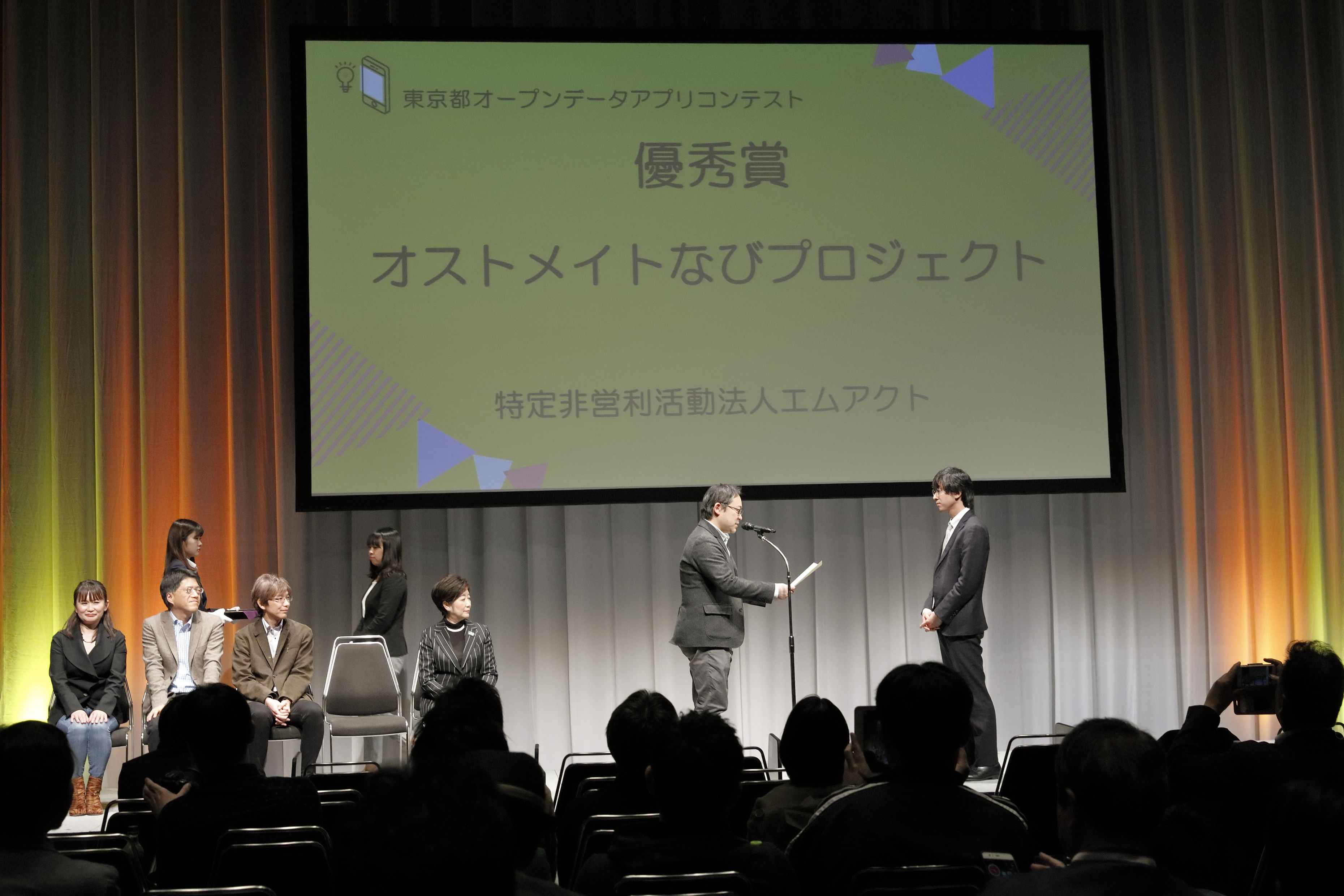 「東京都が提供するオープンデータを駆使して、素晴らしい、都民ファーストなアプリを制作いただき、誠にありがとうございます。データは、活用されて初めてその真価を発揮します。東京都では、都民共有の貴重な財産であるこのデータを、オープンデータとして、2020年までに4万件の公開を目指していきたいと考えています。東京2020大会、そしてその後の将来を見据え、東京都のオープンデータを最大限活用していただき、2020年のレガシーとなるよう、皆様には競い合っていただきたい。そして、新たなアプリの制作に挑戦していただき、このデータを研ぎ澄まし、使いやすくしていただくことで、より良いデータにしていただければと期待しています。」