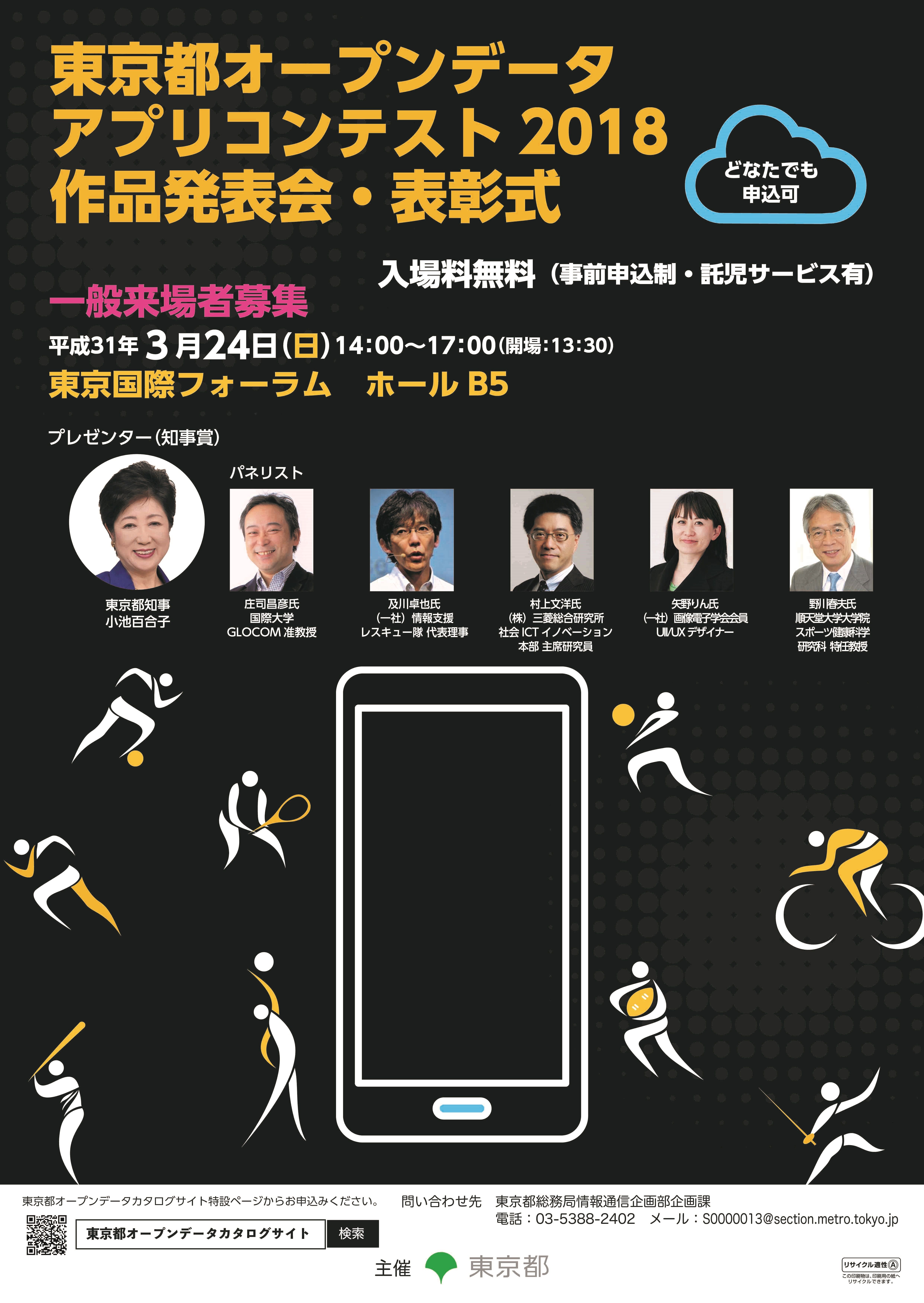 その一環として、『スポーツ』をテーマにオープンデータと「東京都オープンデータアイデアソンキャラバン2018」の参加者によるアイデアを活用したアプリ・Webサービスを募集する、「東京都オープンデータアプリコンテスト2018」を実施しています。