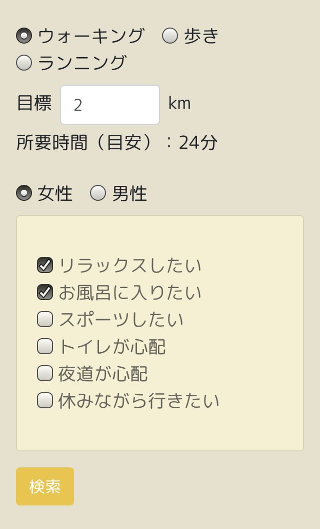リラックスしたり、銭湯に行ったり、運動を目的としなければ、運動を続けやすくなるのではないか。製作のきっかけは、運動嫌いな私がジム通いを続けられた理由(ジムに置いている特別なシャンプーを使いたいという思いがモチベーション)でした。現在6つの条件でランニングコース等を検索できますので、いろいろ条件を変えて検索してみてください。