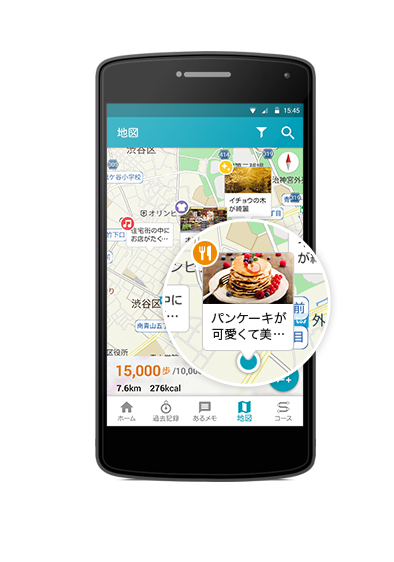 ●ウォーキングマップの閲覧だけでなく、歩数や距離、消費カロリーなどを記録できます。