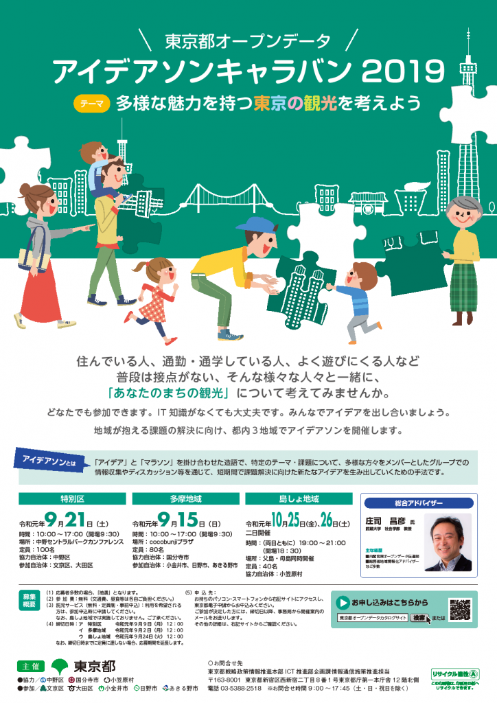オープンデータを活用した行政や地域の課題解決のアイデアを生み出す、「東京都オープンデータアイデアソン」を都内3地域(特別区、多摩地域、島しょ地域)で開催します。