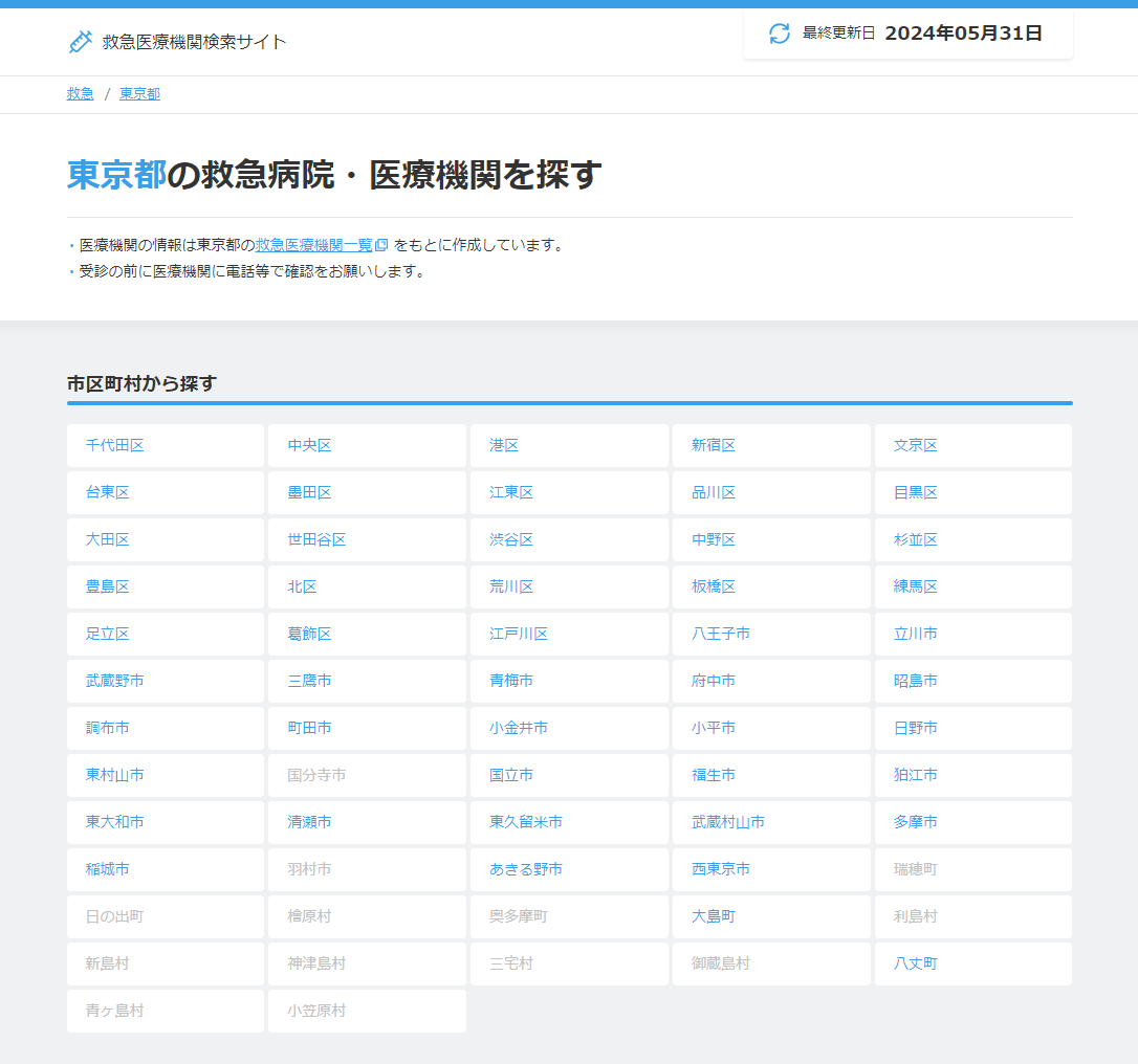 東京都にある救急医療機関を区ごとに一覧化し、現在地から近い順の並び替えや地図から検索できるサービスです。